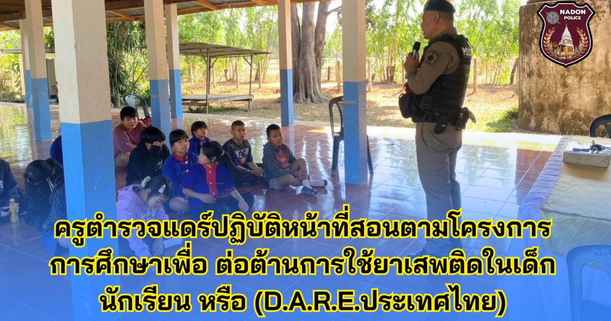วันที่ 17 ม.ค.68 เวลา 13.00-14.00 น. โดยอำนวยการของ พ.ต.ท.บุญรักษ์ เชิดชู สว.สภ.นาโดน มอบหมายให้ ร.ต.ตวีรเดช ชิณจักร รอง สว.(ป.)สภ.นาโดน ครูตำรวจ D.A.R.E. ประจำ สภ.ฯ เข้าสอนตามโครงการการศึกษาเพื่อ ต่อต้านการใช้ยาเสพติดในเด็กนักเรียน หรือ (D.A.R.E.ประเทศไทย) เพื่อให้นักเรียนได้เรียนรู้วิธีปฏิเสธ แรงกดดันที่อาจมีอิทธิพลให้นักเรียนไปเกี่ยวข้องกับ บุหรี่ สุรา ยาบ้า สารระเหย หรือยาเสพติดชนิดอื่นๆ ตลอดทั้งเรียนรู้วิธีการตัดสินใจ และหลีกเลี่ยงความรุนแรงหรือสถานการณ์ความเสี่ยงที่อาจเป็นอันตรายต่อนักเรียนได้