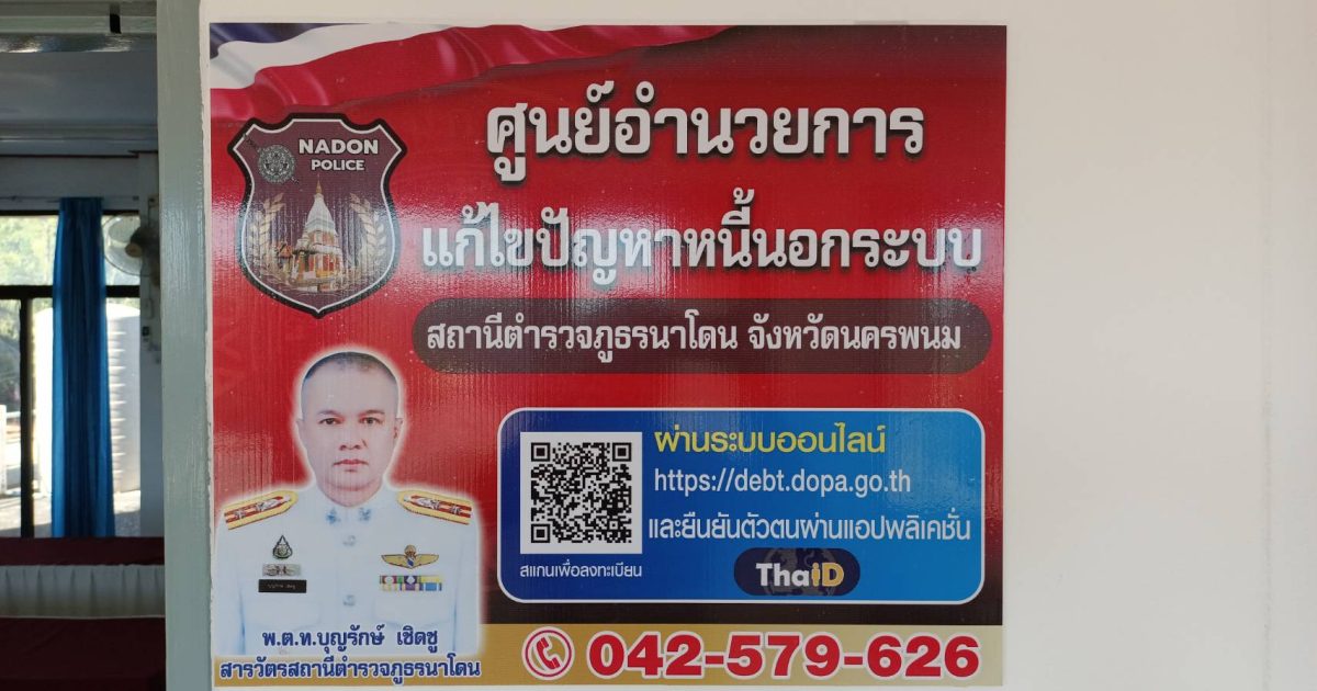 ตามนโยบายวาระแห่งชาติ เรื่อง การแก้ไขหนี้นอกระบบ ซึ่งรัฐาลได้มอบนโยบายและแนวทางการดำเนินการ เมื่อวันที่ 8 ธ.ค.66 ที่ อาคารชาเลนเจอร์ อิมแพค เมืองทองธานี จว.นนทบุรี โดยมี นายกรัฐมนตรีเป็นประธานในการมอบนโยบาย และตำรวจภูธรจังหวัดนครพนม ได้มีหนังสือ ด่วนที่สุด ที่ 0019(ศปน.นพ).52/4821 ลง 7 ธ.ค.66 เรื่อง การตั้งจุดบริการประชาชนรับลงทะเบียบในการขอรับความช่วยเหลือเกี่ยวกับการแก้ไขปัญหาหนี้นอกระบบ นั้น สภ.นาโดน ภายใต้การอำนวยการโดย พ.ต.ท.บุญรักษ์ เชิดชู สว.สภ.นาโดน จึงได้ให้มีการตั้งจุดรับบริการประชาชนฯในเรื่องดังกล่าวขึ้นที่ อาคารที่ทำการ สภ.นาโดน ตั้งแต่บัดนี้เป็นต้นไป จนกว่าจะมีการเปลี่ยนแปลง
