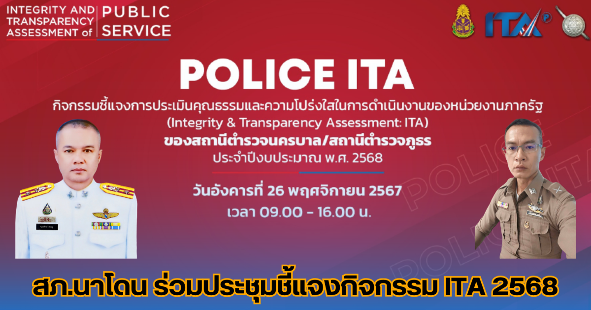 วันนี้ 26 พ.ย.67 ตั้งแต่เวลา 09.00 – 16.00 น. พ.ต.ท.บุญรักษ์ เชิดชู สว.สภ.นาโดน พร้อมด้วย ด.ต.เดี่ยว พรรรมาตย์ ผบ.หมู่(ป.)ฯ เจ้าหน้าที่ ITA สภ.นาโดน ร่วมประชุมชี้แจงการประเมินคุณธรรมและความโปร่งใสในการดำเนินงานของหน่วยงานภาครัฐ (ITA) ของสถานีตำรวจ ประจำปีงบประมาณ พ.ศ. 2568 รูปแบบ Online