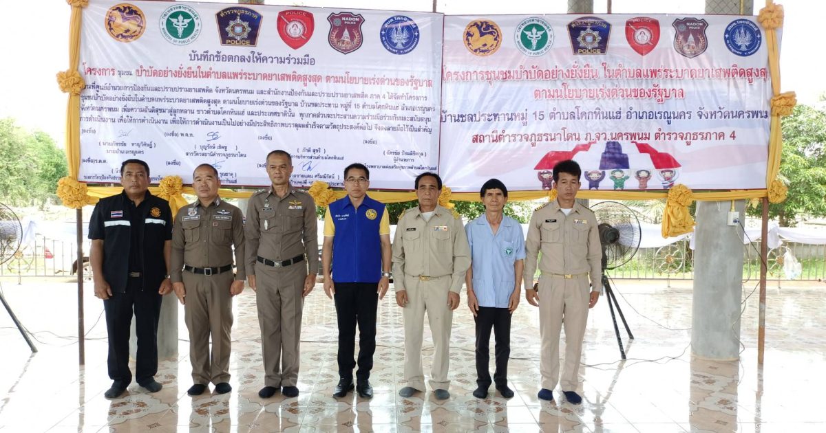 วันนี้ 10 มิ.ย.67 เวลา 13.30 น. สถานีตำรวจภูธรนาโดน ได้จัดพิธีเปิดโครงการชุมชนบำบัดอย่างยั่งยืนในพื้นที่แพร่ระบาดยาเสพติด ตามนโยบายเร่งด่วนของรัฐบาล และลงนามในบันทึกข้อตกลงให้ความร่วมมือ (MOU) เพื่อแสดงถึงเจตนารมณ์ อันมุ่งมั่นตั้งใจที่จะร่วมดำเนินการแก้ปัญหายาเสพติด โดยมี นายภัทรชัย หาญวิศิษฎ์ นายอำเภอเรณูนคร เป็นประธานในพิธีฯ และมี พ.ต.ท.บุญรักษ์ เชิดชู สว.สภ.นาโดน หัวหน้าสถานี,นายฉัตรชัย ป้อมลิขิตกุล ผอ.รพ.สต.โคกหินแฮ่,นายภักดี สุขรี นายกองค์การบริหารส่วนตำบล โคกหินแฮ่,นายชายแดน ศรีมณีรัตน์ผู้ใหญ่บ้านหมู่ที่ 15 บ้านชลประทาน,นายคริสต์มาส รุณธาตุ กำนันตำบลโคกหินแฮ่ พร้อมข้าราชการตำรวจชุดชุมชนยั่งยืน และปราบปรามยาเสพติด สภ.พระซอง และประชาชนบ้านชลประธานหมู่ที่ 15 อสม.จำนวน 20 คน เป็นสักขีพยานเข้าร่วมพิธี ณ ศาลาวัดชลประทานนิมิต บ้านชลประทาน หมู่ที่ 15 ต.โคกหินแฮ่ อ.เรณูนคร จ.นครพนม