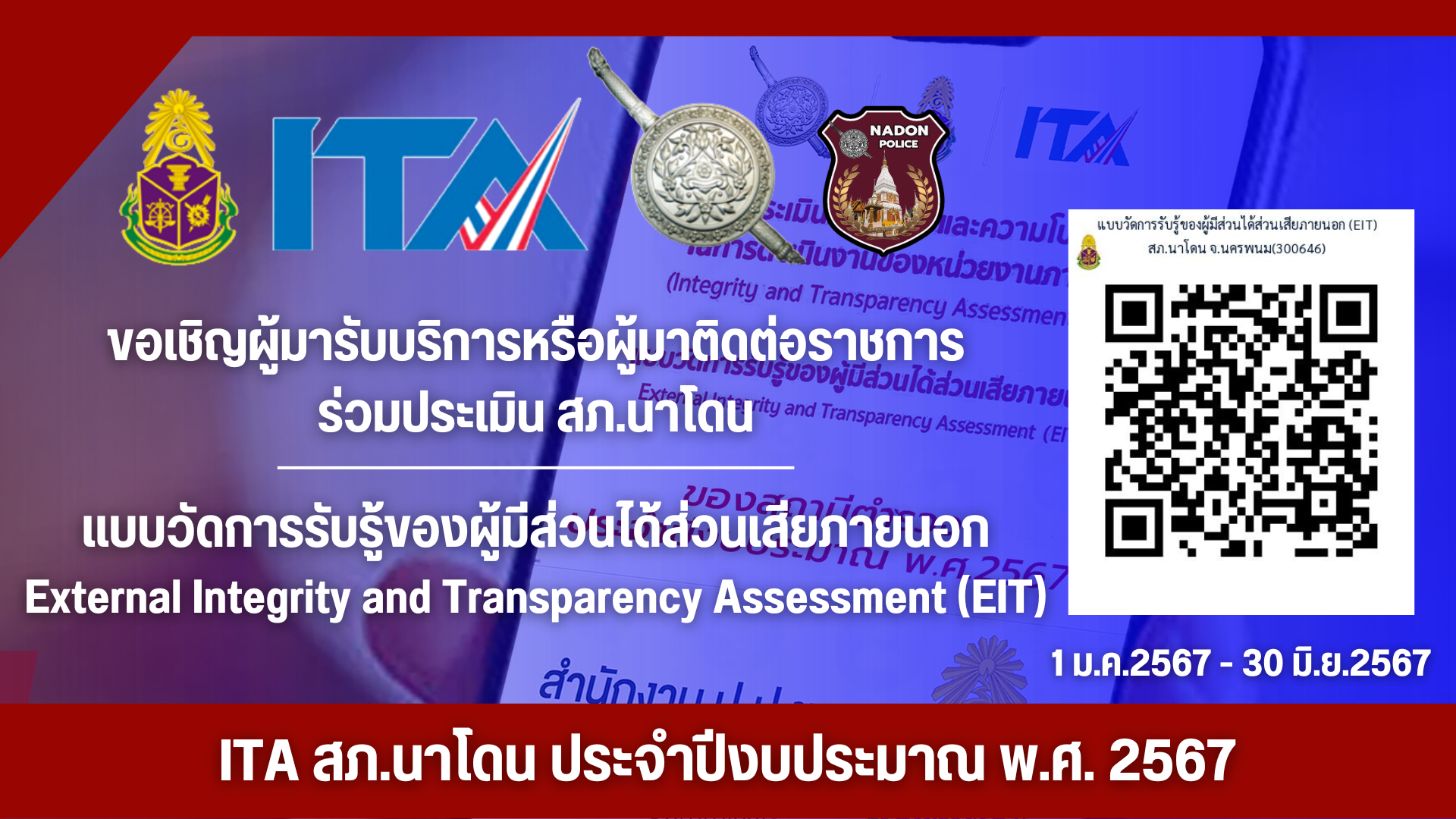 “เชิญชวนประชาชนผู้มารับบริการบนสถานีตำรวจภูธรนาโดน ทำแบบประเมินคุณธรรมและความโปร่งใสในการดำเนินงานขอ