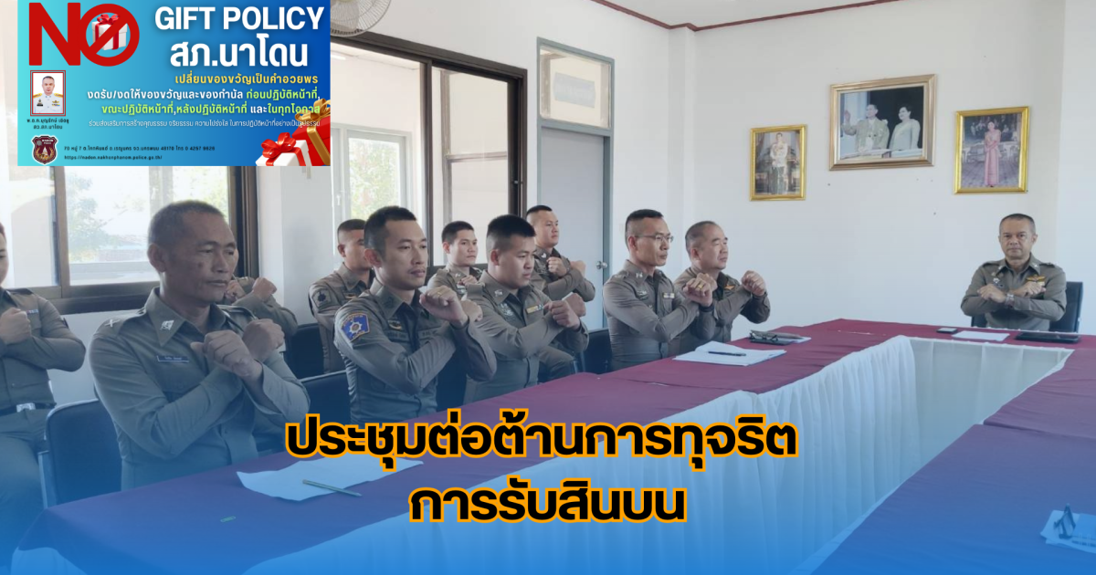 เนื่องด้วยใกล้เทศกาลปีใหม่ 2568 หรือเทศกาลสำคัญต่างๆ เมื่อวันที่ 24 ธ.ค.67 เวลา 11.00 น. นำโดย พ.ต.ท.บุญรักษ์ เชิดชู สว.สภ.นาโดน , ร.ต.อ.ไชบัญชา วังคะฮาต รอง สว.(สอบสวน) สภ.นาโดน พร้อมด้วยข้าราชการตำรวจในสังกัด ร่วมประชุมชี้แจงประกาศนโยบายต่อต้านการทุจริต ต่อต้านการรับสินบน ไม่รับสินบน สินน้ำใจ ของกำนัล ของขวัญ ทรัพย์สิน หรือ ประโยชน์อื่นใดอันคำนวณเป็นเงินได้ ก่อนการปฏิบัติหน้าที่ ขณะปฏิบัติหน้าที่ หรือหลังปฏิบัติหน้าที่ และในทุกโอกาส ไม่ว่าจะเป็นเทศกาล หรือวันสำคัญ หรือเพื่อเป็นการตอบแทนจากการปฏิบัติหน้าที่ ณ ห้องประชุม ชั้น 2 สภ.นาโดน